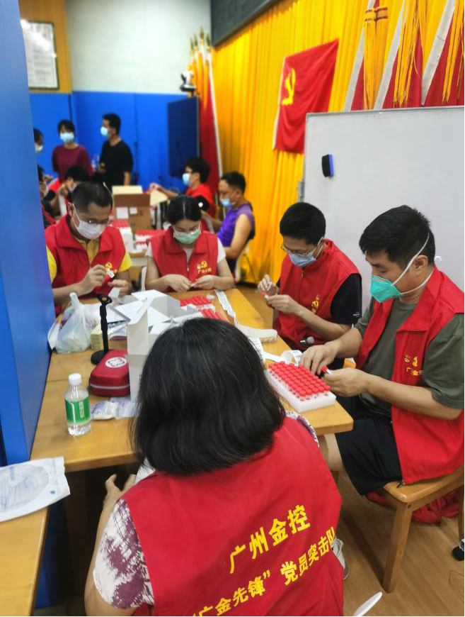 “各位队员,根据疫情防控要求……请务必落实到位。”“各位队员,请大家抓紧时间吃饭,在社区服务中心短暂休息后,再作今晚最后一轮排查冲刺。”“各位队员,12:20回到社区培训,领新任务。”“金控队员,魏大姐和身体刚恢复的王娟2人留守电话流调,其余8人协助医护上门核酸,老孙教大家准备防护物资,10分钟后到门口集合。”“各位队员,我和刘洋给大家准备了一些消暑的水果以及一些药品,大家休息可以吃些水果补充水分和糖分,或者身体感觉不适时可以吃一些降暑药,口服液和胶囊的都有。”“各位队员,午餐(晚餐)都已经送到了,先完成任务回来的队员可以先吃。”“广州金控集团支援南沙区海湾社区服务队10人,今日完成两项任务:1.协助医护人员上门给红码人员核酸检测314户,320人;2.电话流调155人。”队长崔云培和副队长彭亨畅一边参加排查,一边对接社区和队员,采购防疫物资、协调落实新任务、发布温馨提示、总结每天工作、保障用餐住宿等,发挥了很强的统筹协调能力。