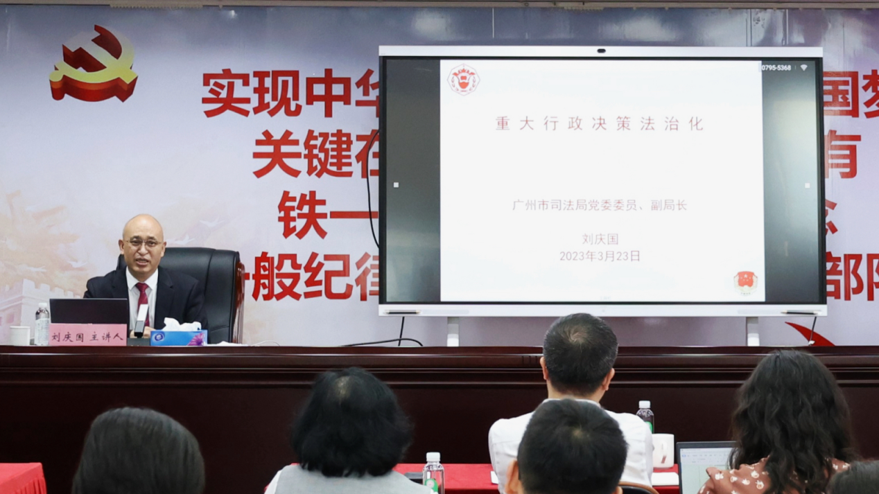 刘庆国副局长围绕重大行政决策法治化这个主题,阐释了行政决策及行政决策法治化的内涵和意义,回顾了广州市行政决策法治化实践探索的起步阶段、发展阶段和探索阶段,对《广州市重大行政决策程序规定》修订背景和主要内容进行深入解读,最后通过案例剖析的形式引发大家对于决策法治化的深入思考。