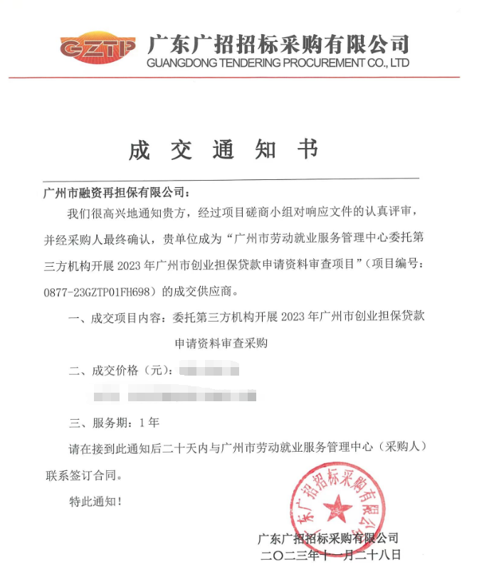 近日,根据“广州市劳动就业服务管理中心委托第三方机构开展2023年广州市创业担保贷款申请资料审查项目”竞争性磋商的结果显示,广州金控集团旗下广州市融资再担保有限公司(简称广州再担保)凭借可靠的服务质量、踏实的工作作风、优秀的服务团队以及较强的综合实力,第三次中标成为广州市创业担保贷款申请资料审查项目服务的供应商。