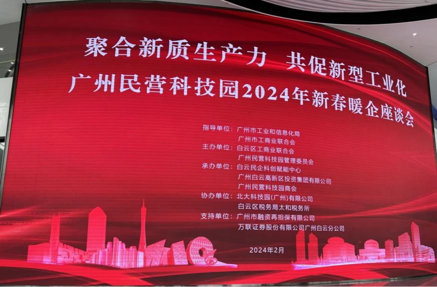 由广州民营科技园组织,广州金控集团旗下万联证券白云分公司和广州市融资再担保公司共同支持的2024年新春暖企座谈会,于近日成功举办。市工商联副局级干部李洁明、白云区政协党组书记袁东华、市工信局领导、区相关职能部门领导、万联证券白云分公司、广州市融资再担保公司等专业服务机构以及民科园30家龙头企业代表等方面出席本次座谈会。本次会议深入学习贯彻党的二十大精神和习近平总书记视察广东重要讲话、重要指示精神,落实省、市、区高质量发展大会部署要求,与企业家、行业专家共谋发展策略,凝聚发展合力,推动整合科技创新资源,加快形成新质生产力,共促新型工业化高质量发展。
