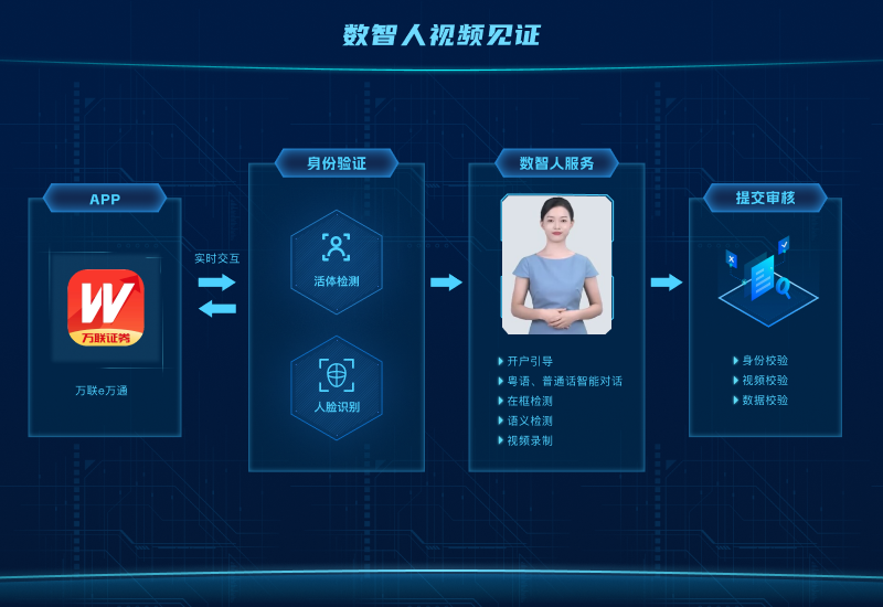 “数智人视频见证”项目作为万联证券面向粤港澳大湾区投资者的非现场业务服务平台,融合虚拟数字人、ASR语音识别、NLP语义理解、智能回访等多项AI技术,实现了港澳投资者线上业务办理全流程全面优化,进一步提升了跨境投资和财富管理的便利化程度。