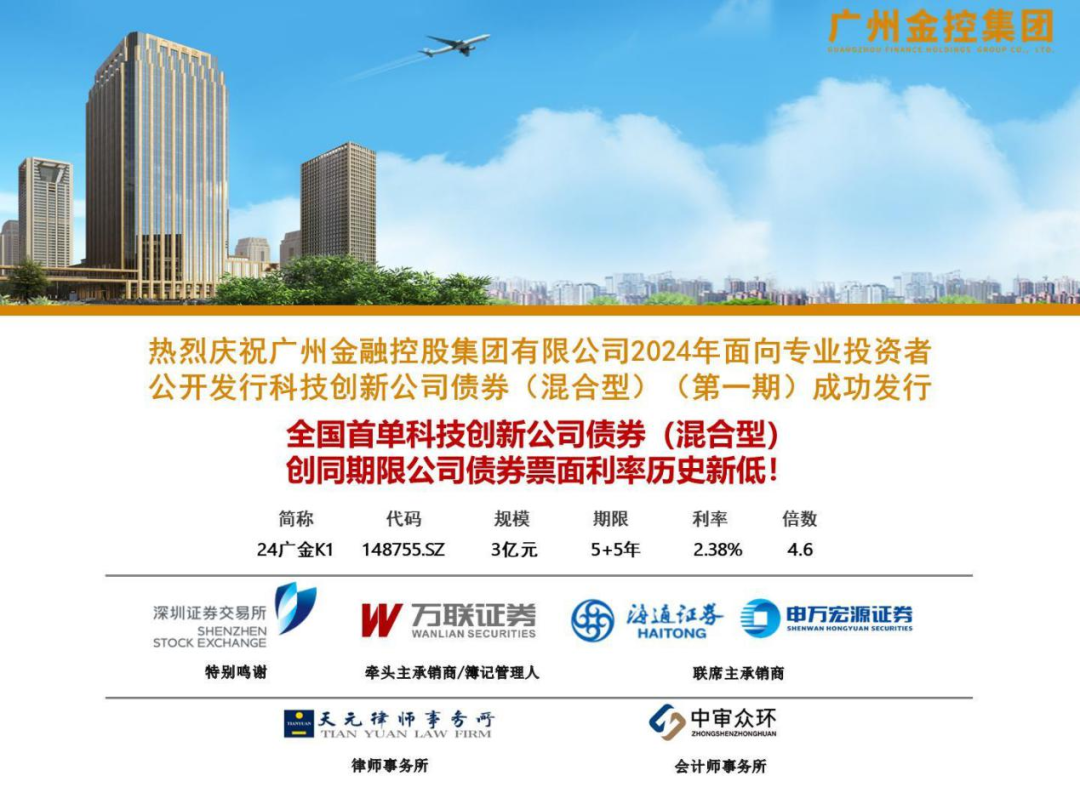 2024年面向专业投资者公开发行科技创新公司债券(混合型)(第一期)在深圳证券交易所(以下称深交所)成功发行。本期债券发行规模3亿元,期限5+5年,票面利率2.38%,全场认购倍数达4.6倍,发行利率创同期限公司债券票面利率历史新低。