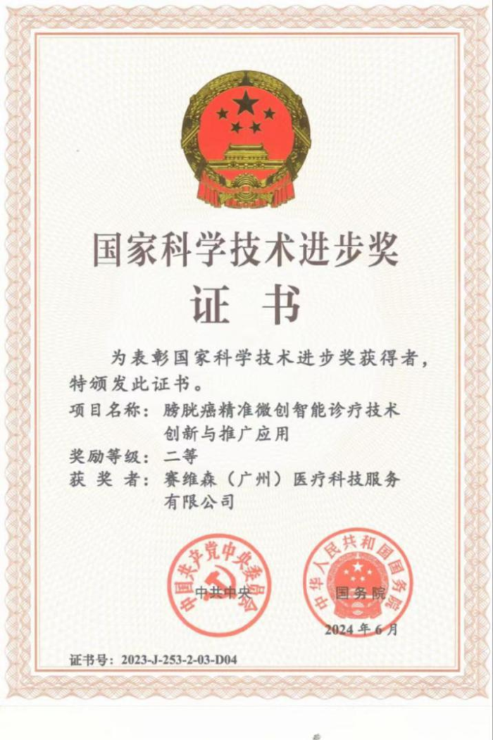 近日,在京召开的全国科技大会、国家科学技术奖励大会、两院院士大会上,广州金控基金投资企业——赛维森科技作为主要完成单位,联合中山大学孙逸仙纪念医院、深圳市精锋医疗科技股份有限公司、广州市基准医疗有限责任公司共同完成的“膀胱癌精准微创智能诊疗技术创新与推广应用”项目荣获国家科学技术进步奖二等奖。