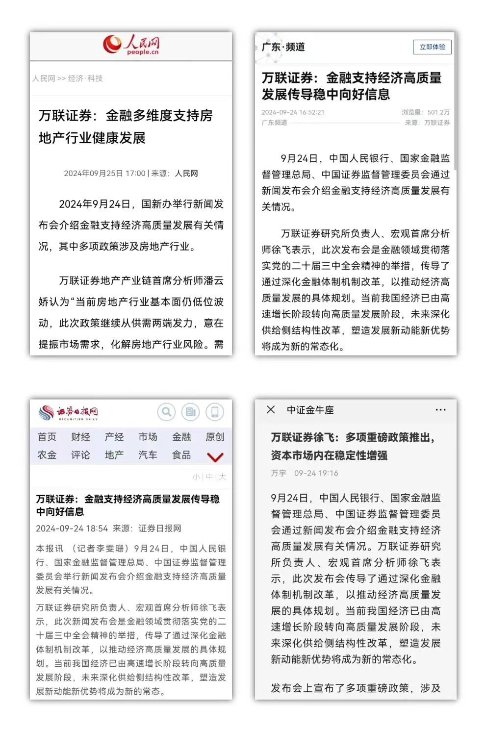 万联证券主动作为,依托机制优势,以“三个紧抓” 积极推动提振资本市场政策宣传解读。紧抓宣传时效,通过信息传导机制,打通研究宣传关节,确保在政策发布后第一时间引导正向解读;紧抓宣传广度,在多家权威央媒和行业主流媒体发布解读文章十余篇次,提升对最新政策宣传解读的高度、广度,确保多层媒体传达不同受众;紧抓解读质量,紧密围绕会议和政策重点,引导受众理解政策,提振信心,确保守正创新扩大解读宣传影响。据不完全统计,万联证券近期解读宣传新闻媒体点击量逾千万,取得了极佳的社会宣传效果。