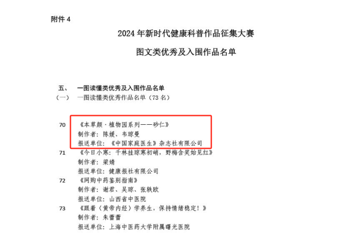 近日,国家卫生健康委与科技部、国家中医药局、国家疾控局、中国科协等部门联合公布了2024年新时代健康科普作品征集大赛优秀及入围作品名单,广州金控集团旗下《中国家庭医生》杂志社有限公司(以下简称家医杂志社)的《本草颜·植物园系列——砂仁》获得一图读懂类优秀作品。