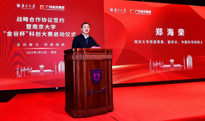 中国科学院院士,南京大学党委常委、副校长郑海荣在致辞中指出,近年来南京大学通过“深挖潜力、外扩合作、资本赋能”等举措,力争把学校打造成为区域技术转移的重要引擎。今天与广州金控集团开展战略合作签约,是双方共同贯彻落实党的二十届三中全会精神的务实之举,也是双方深入推动资金链、创新链、供应链、产业链“四链”融合的创新作为。南京大学将以本次签约和大赛为契机,与广州金控集团共同围绕科技创新、成果转化、校友资源挖掘、人才交流等领域开展全方位合作,大力支撑创新成果加速从实验室走向市场,并期待能够发挥好科创大赛平台的集聚效应和辐射作用,吸引更多优秀项目落地生根、开花结果。