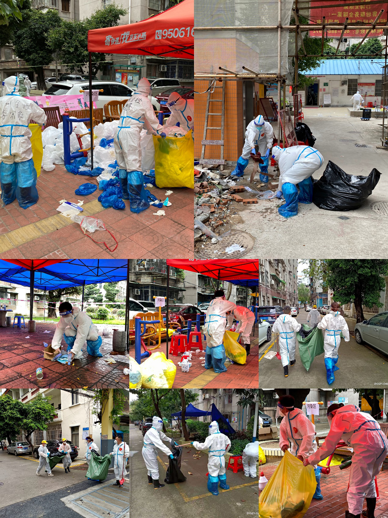 记者了解到,清洁观鹤小区的医疗垃圾和生活垃圾工作强度非常大,队员们冒着被感染的风险,顶着生活垃圾散发出的臭味,在污染区把医疗垃圾一一装进垃圾袋,进行消杀、密封处理,再肩扛、手提运往居委会附近的垃圾池。广州近期都是高温、暴雨天气,队员们穿着防护服,很快就挥汗如雨,汗水直往眼睛流,却不能擦,又痛又痒,非常不舒服,防护面罩也很快被水雾遮住,根本看不清前方,穿着防护服也很不方便上厕所,队员们都忍着尽量少喝水,条件非常艰辛。有队员表示:现场工作氛围异常紧张,身边又响起救护车急促的鸣笛声,如同战场上的隆隆炮声,感觉大家正在没有硝烟的战场上舍生忘死地工作!