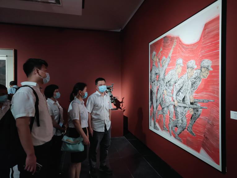 美术作品展紧扣建党百年主题,以百年党史为主线,主要分为新民主主义革命时期、社会主义革命和建设时期、改革开放和社会主义现代化建设新时期和中国特色社会主义进入新时代四个板块,涵盖国画、油画、版画、雕塑等多个艺术门类,生动展现了中国共产党百年来带领中国人民进行革命、建设、改革的壮美画卷,热情讴歌了党的十八大以来,在以习近平同志为核心的党中央坚强领导下,我们国家取得的历史性成就、发生的历史性变革,展示了全面建设社会主义现代化强国的光明前景。作品展既体现了思想高度和党史厚度,又体现了情感温度和艺术深度。结合讲解员绘声绘色的讲解,大家切身实地感受到作品中蕴含的艺术魅力和澎湃力量,为先辈们作出的伟大斗争,为党百年来取得的光辉成就,为祖国改革开放的巨大腾飞赞叹不已。
