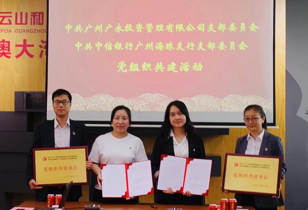 为贯彻落实广州金控集团党委“1+2+2+2+6”工作举措,助推“红联共建”工作机制,11月20日上午,广州广永投资管理有限公司党支部与中信银行广州海珠支行党支部举行党建共建协议签约仪式。广永投资党支部书记、副总经理钟彩霞,中信银行海珠支行党支部书记、行长叶华等出席活动。共建双方党员和入党积极分子20余人参加活动。