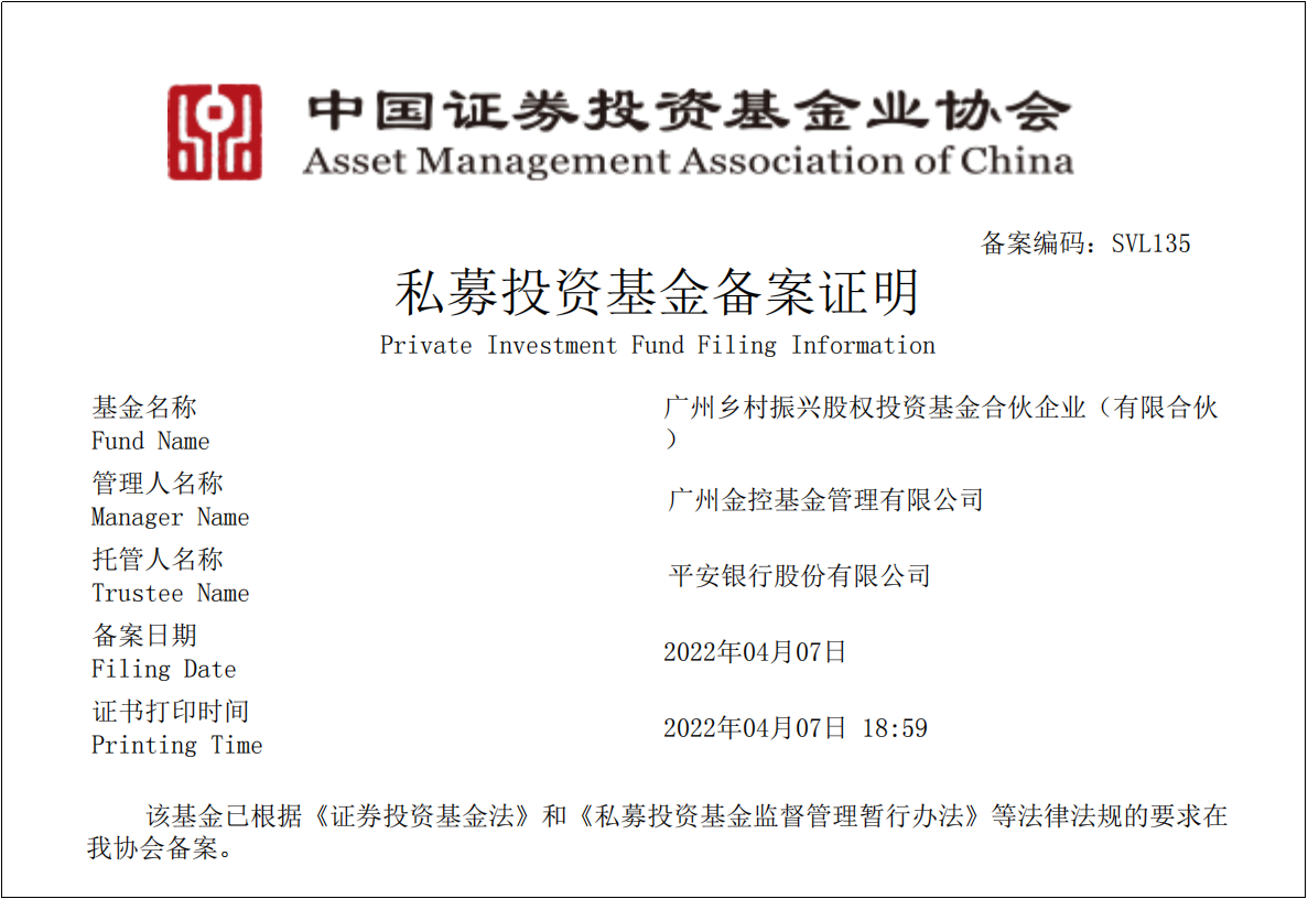 近日,由广州金控集团发起设立的广州乡村振兴股权投资基金合伙企业(有限合伙)(简称广州乡村振兴基金)完成中国证券投资基金业协会备案,进入投资运营阶段。