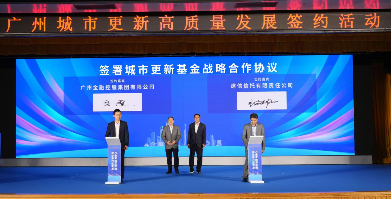 3月23日下午,广州城市更新高质量发展签约活动在建设银行广东省分行举行,广州金控集团与建信信托有限责任公司签署战略合作协议,拟组建规模为1000亿元城市更新股权投资基金。广州市有关领导,中国建设银行党委委员、副行长纪志宏,中国建设银行广东省分行党委书记、行长张伟煜,广州市住房和城乡建设局党组书记、局长王宏伟等领导出席活动;广州金控集团党委书记、董事长聂林坤,广州金控集团副总经理王达,建信信托总裁孙庆文、副总裁王业强等领导参加签约仪式。