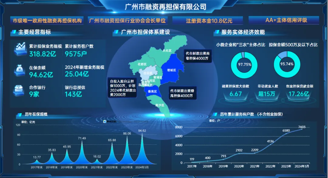 服务广度显著扩大。截至2024年4月末,广州再担保小微企业和“三农”占融资担保业务占比96.77%,服务单户担保金额500万元及以下企业的占比93.31%。公司担保业务涵盖了“农、林、牧、渔业”、“制造业”、“租赁和商务服务业”“科学研究和技术服务业”等《中小企业划型标准规定》适用的15个行业,并重点支持科创型企业和劳动密集型企业,精准服务专精特新、创业创新、战略新兴、“三农”等市场主体,持续扩大担保覆盖面。