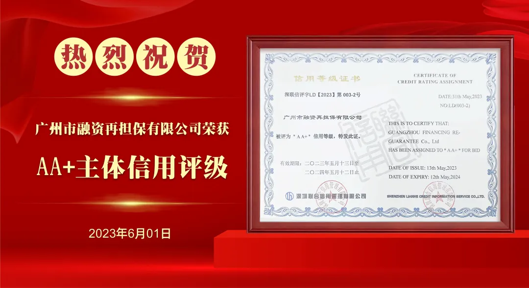 2023年5月,广州再担保主体信用评级由AA 提升至AA+,成为广州市首家获得AA+主体信用评级的政府性融资担保机构。此外,公司还获得广东省财政厅政府性融资担保机构绩效考核“优秀”等级,广东省融资担保公司年度监管评级“A”等级,入选广东再担保向国家融资担保基金推荐的全国示范担保机构。
