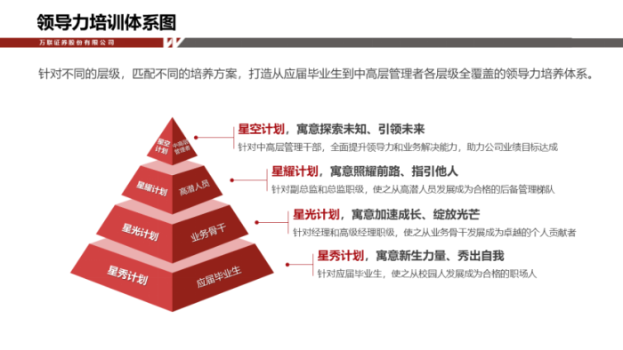 星耀计划是万联证券领导力培养体系的重要组成部分,面向绩效表现突出、有管理潜力的总监及副总监职级员工。项目紧扣公司“十五五”发展规划和高质量发展要求,融合证券行业的通用管理能力学习地图,通过在线学习、线下集训、能力测评、挑战性任务及课后检测等多元方式,为高潜人员全面夯实管理基础,系统提升关键领导力,进而增强组织竞争力,切实推动以人才发展驱动企业发展。