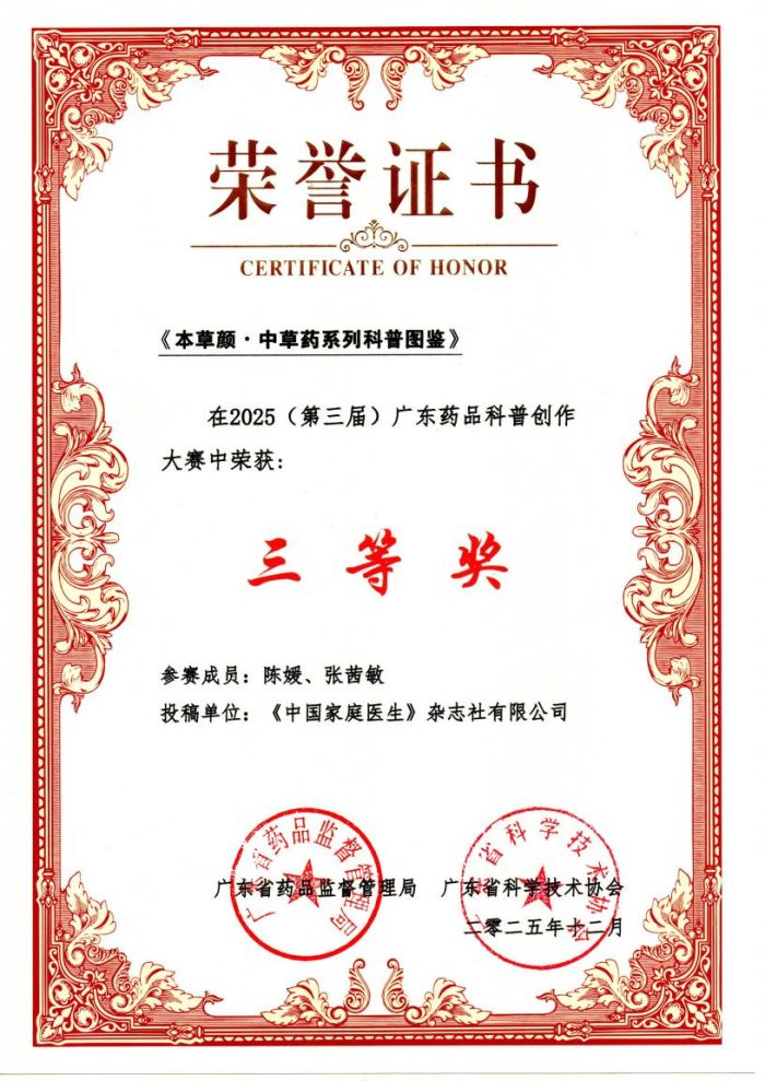 近日,由广东省药品监督管理局和广东省科学技术协会联合主办的2025(第三届)广东药品科普创作大赛颁奖礼在广东科学中心顺利举行。广州金控集团旗下《中国家庭医生》杂志社有限公司(以下简称家医杂志社)荣获该赛事三等奖。