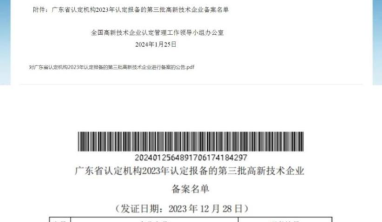 近日,全国高新技术企业认定管理工作领导小组办公室发布《对广东省认定机构2023年认定报备的第三批高新技术企业进行备案的公告》...